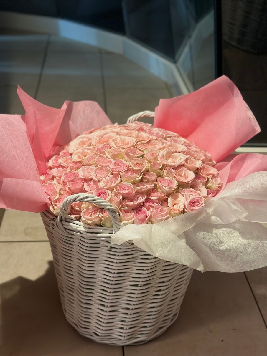 A breathtaking statement piece: 151 classic roses arranged into our signature, perfectly even dome and presented in a hand-painted couture white wicker basket 🥰
