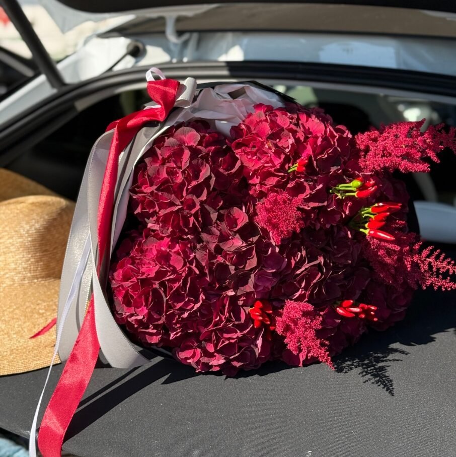 A bold, haute couture floral statement designed to command attention in the most sophisticated settings — from a modern penthouse to a candlelit dinner. “A Rare Masterpiece in Crimson Hues” explores the depth and passion of red through rare, seasonal textures, sculpted into a rich, voluminous silhouette that feels both modern and timeless.