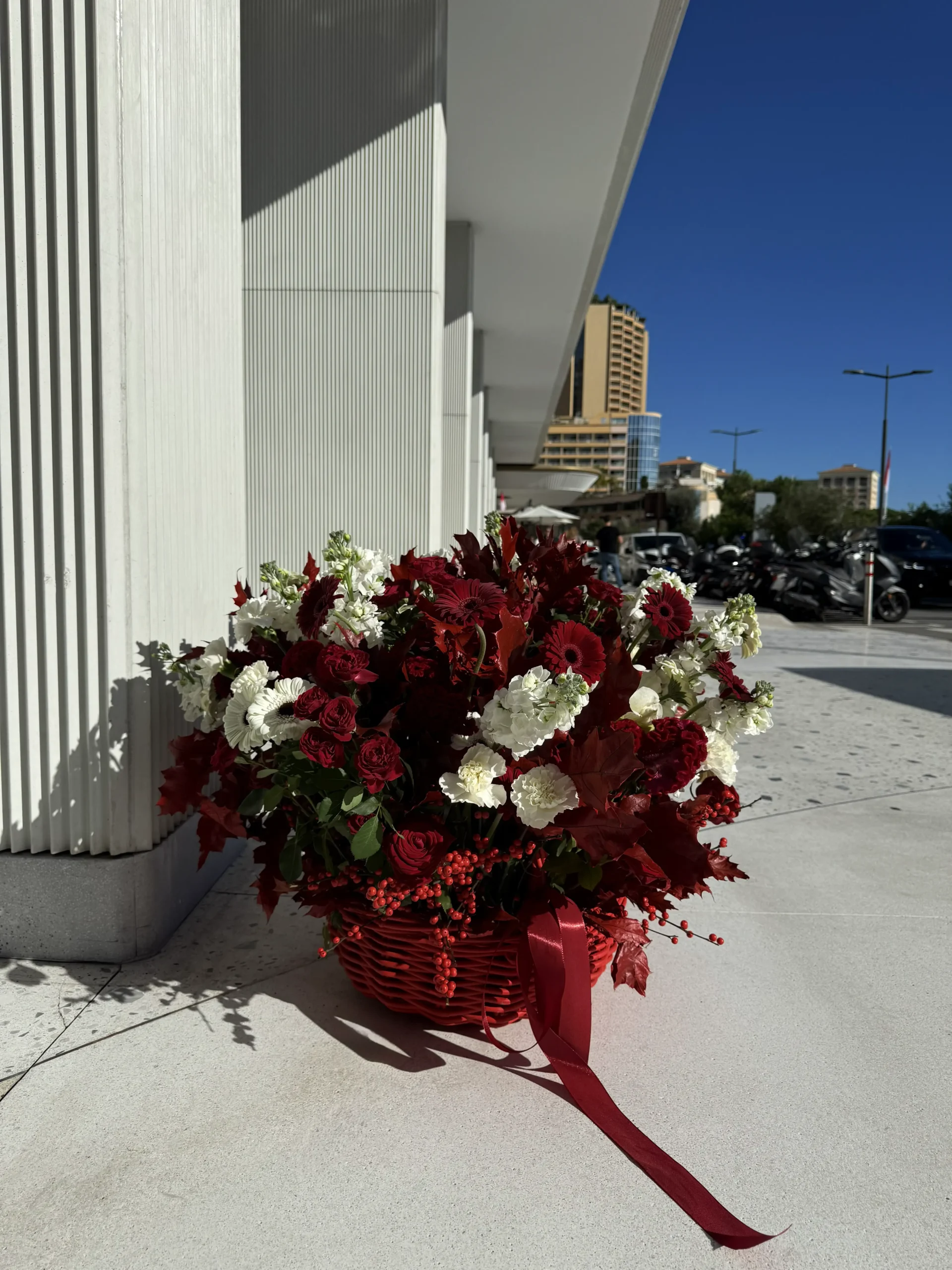 A grand, ceremonial masterpiece designed to honor the prestige and cultural heritage of Monaco. “Heritage of the Principality” is a Sovereign Day signature arrangement, meticulously crafted in the official red-and-white palette to reflect the dignity and elegance of the Monégasque national colors.
